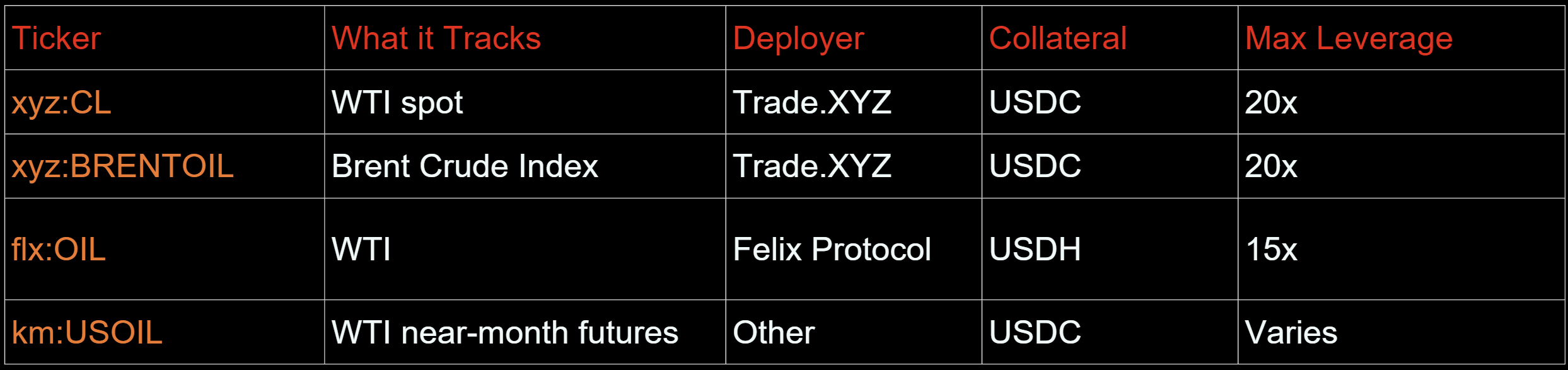 Felix Protocol (flx: prefix) — The original deployer that launched crude oil on Hyperliquid on January 9, 2026. Their flx:OIL also tracks WTI. Key difference: Felix settles in USDH (not USDC), with max leverage around 15x.